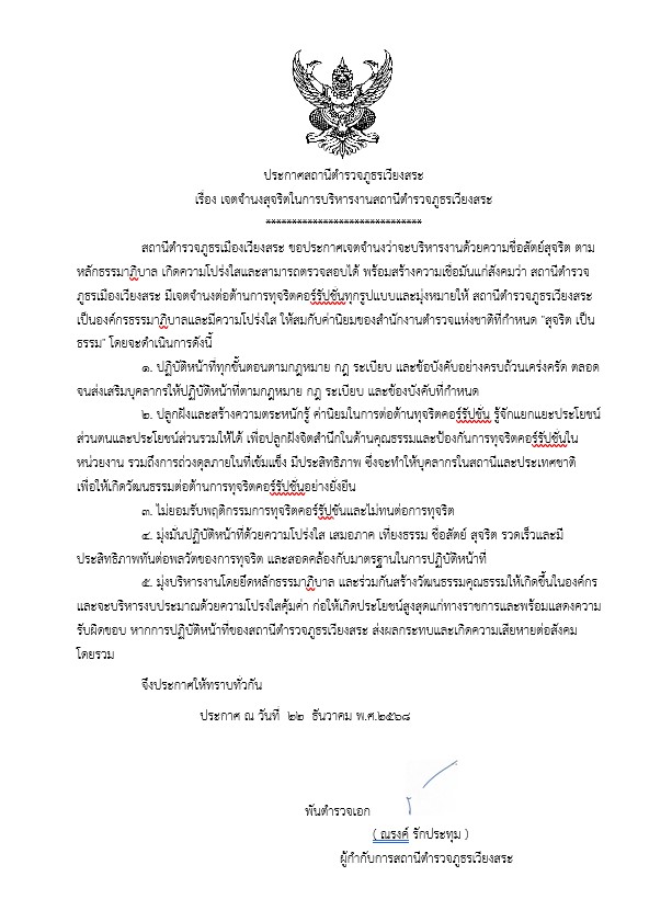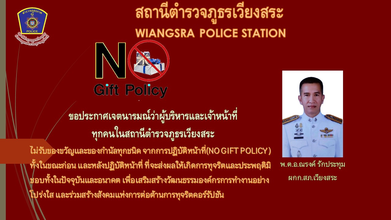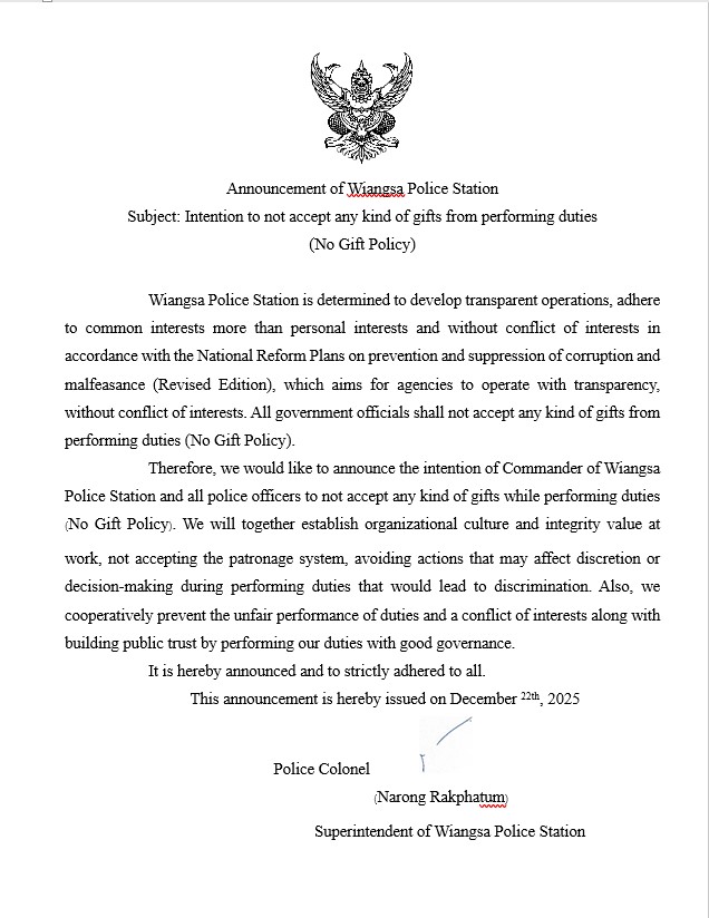 ประกาศสำนักงานยุทธศาสตร์ตำรวจเรื่องเจตนารมณ์ที่จะไม่รับของขวัญหรือของกำนัลทุกชนิดจากการปฏิบัติหน้าที่